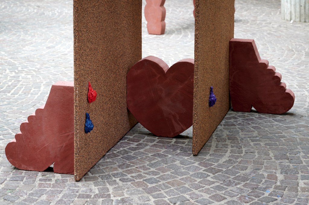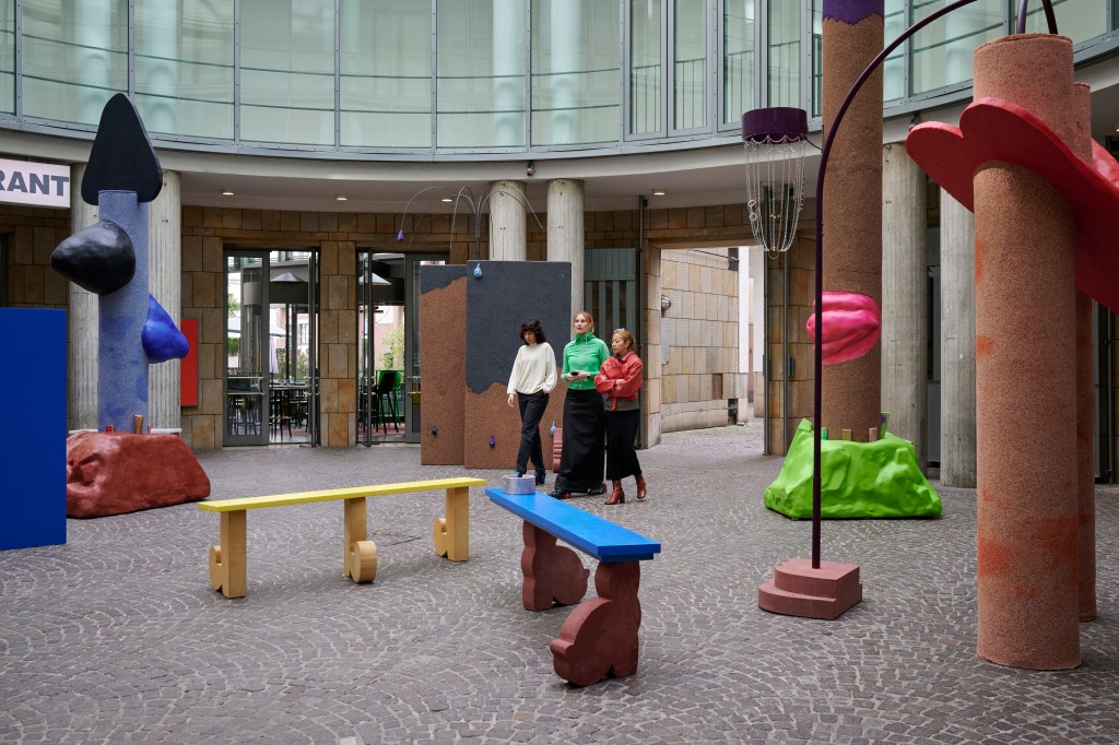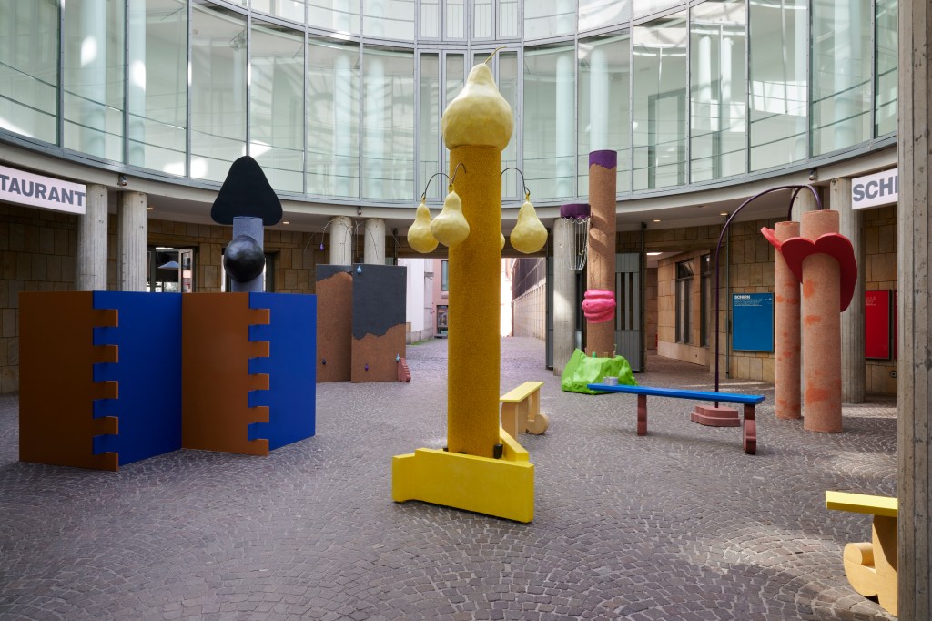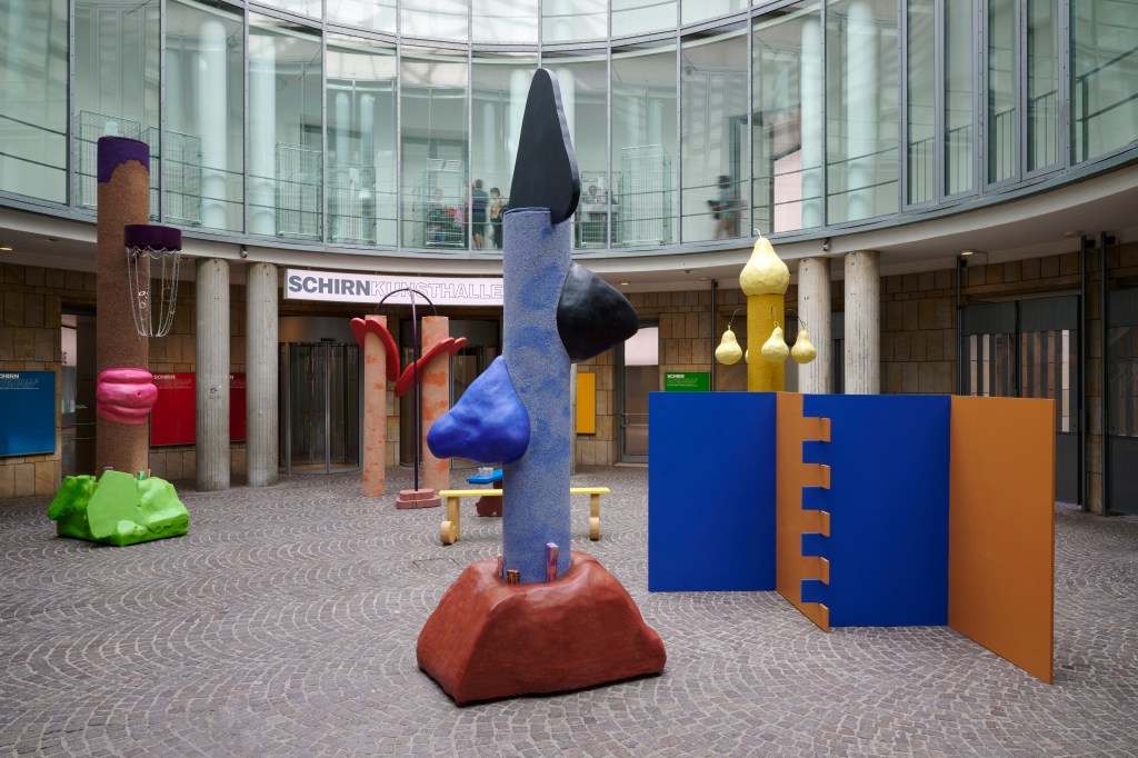 Who builds what, where, and for whom? Influenced by architectural history, Maruša Sagadin (b. 1978) examines the social aspects upon which a building or place is based. Her artistic work operates at the interface between private and public spaces and combines elements from architecture, sculpture, and painting. Sagadin employs humor and exaggeration in both her language of form and use of color to reveal mechanisms of inclusion and exclusion and to break with established codes of art observation. In a playful and subversive manner, her works refer to elements of pop and subculture and applied art. In the interaction between gender, language, and sculpture, they subvert existing norms and thematize sculpture as a form of visualization. On the occasion of Slovenia’s presentation as guest of honor at the Frankfurt Book Fair 2023, the artist is realizing new works in the Rotunda of the SCHIRN which responds to the specific characteristics of this semipublic space.